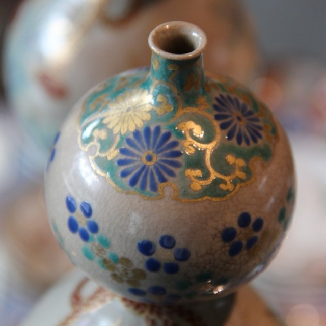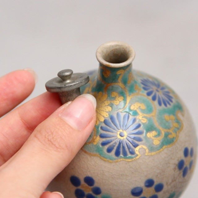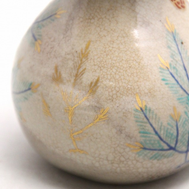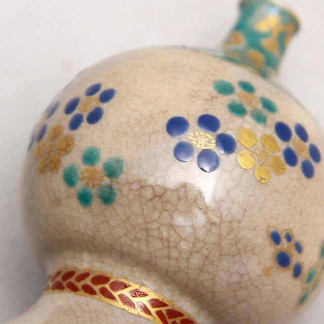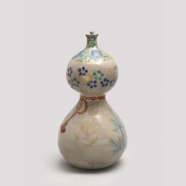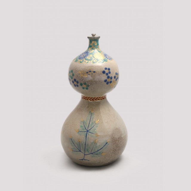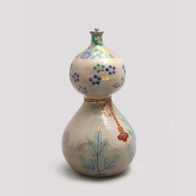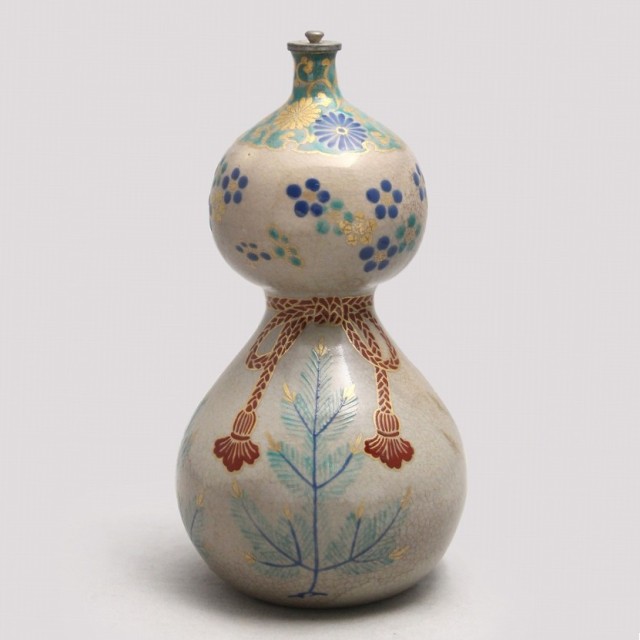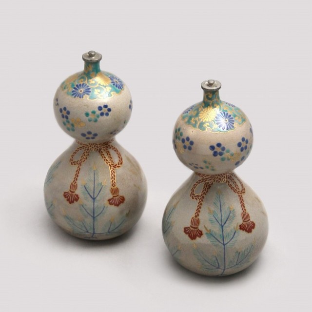 "Antique Kyo Ware (Ko-Kiyomizu) Pair of Gourd-shaped Sake Bottles with Pine, Plum, and Chrysanthemum Design — with Pewter Lids a
