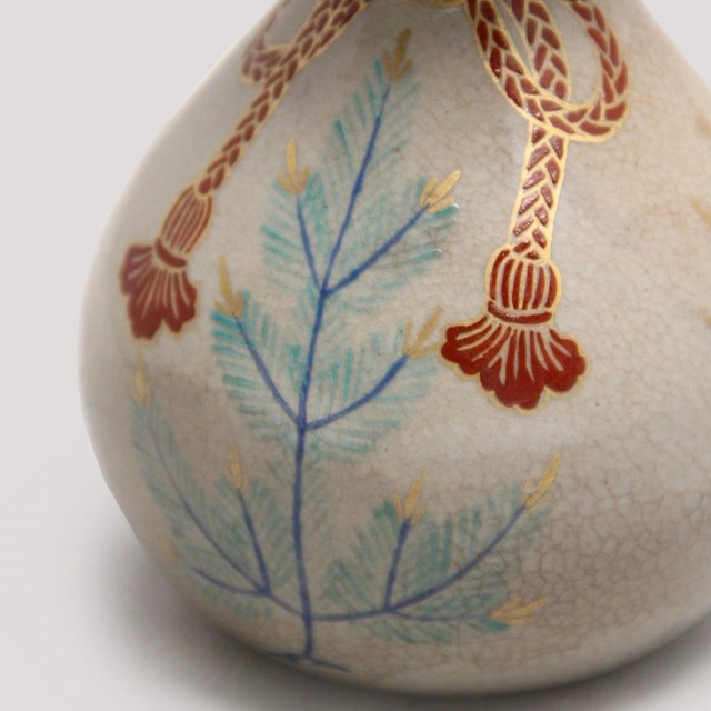 The elegant gourd-shaped form is delicately decorated with auspicious motifs of pine, plum, and chrysanthemum, highlighted with fine gold detailing.