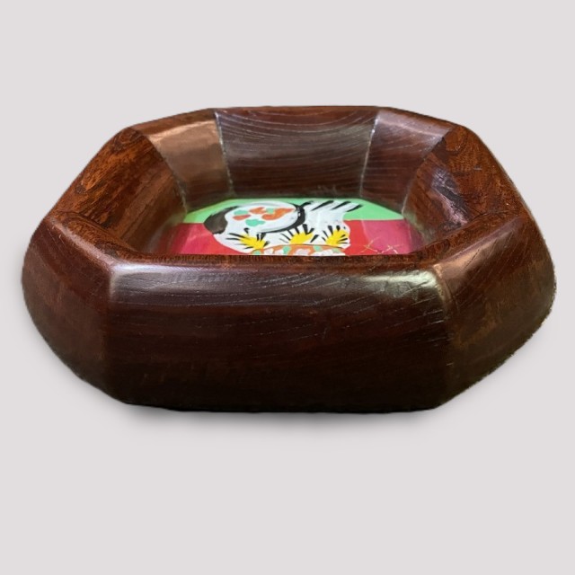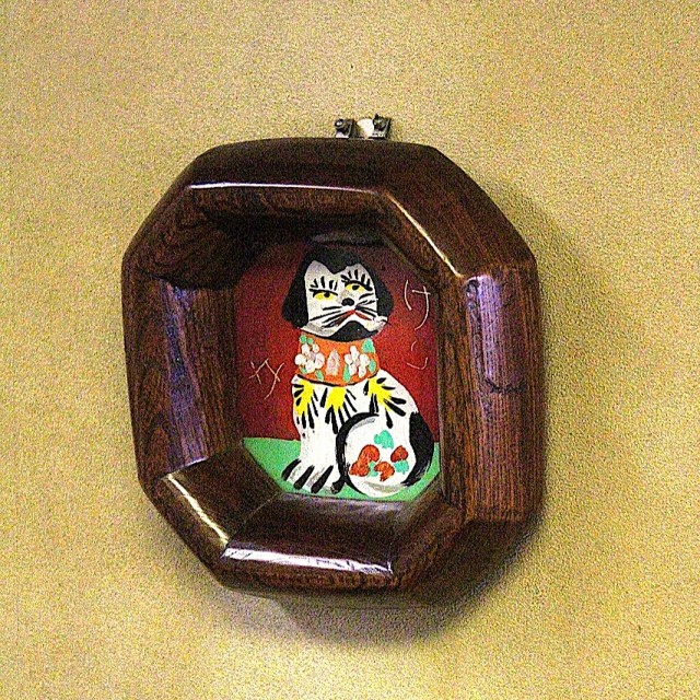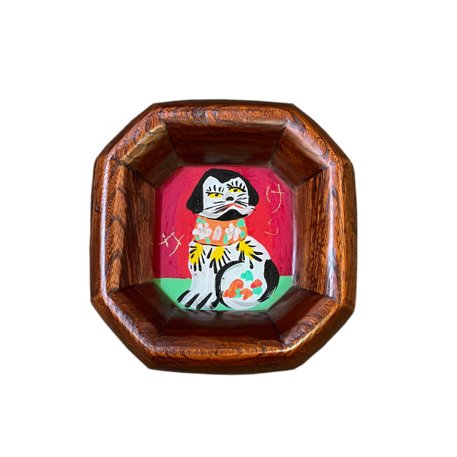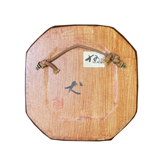 This particular work is set in an octagonal wooden frame and features a charming, colorfully painted dog. The dog's expression, depicted against a vivid red and green background, conveys a sense of humor and reflects the playful spirit and warmth of the Mingei (folk craft) movement.