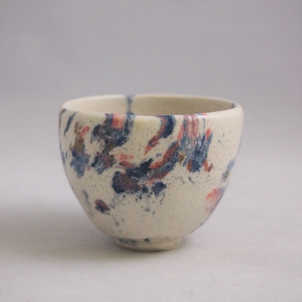 It is painted with blue and pink marbled patterns on a raw-colored ground. There is a "康" mark on the side of the base. Matsui Kosei became a living national treasure for his neriage technique. He has a somewhat unusual background, having worked as a potter while performing his duties as the chief priest of Gessho-ji Temple in Kasama City. Neriage is a technique of combining different colored clay to create patterns.