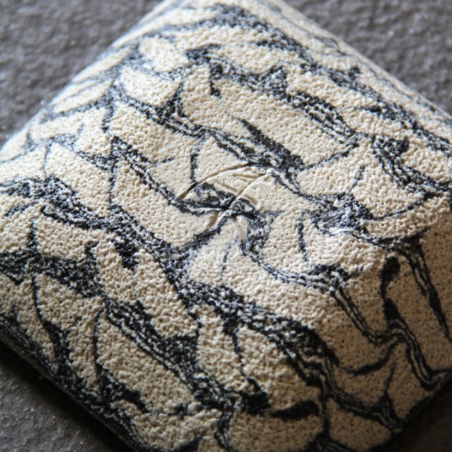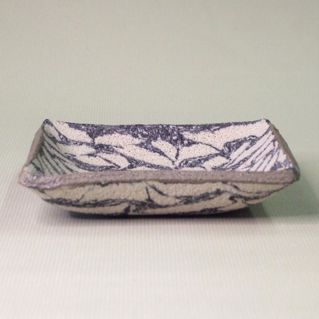 練上の技法は中国 唐時代の頃より始まったと言われています。松井康成は、その技法を唯一無二の独自のものとして昇華させました。少しザラザラとした表面に群青色と白色で色だけされた幾何学的な文様が表されています。氷裂文様やさざなみのようにも見えます。高台はなく、平たい底になっており、底部に「康」の彫銘があります。小ぶりで、お菓子や副菜、取り皿としてお使い頂ける大きさです。