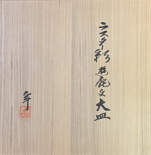 ▲箱の蓋には、「ラスター彩遊鹿文大皿」、加藤卓男の署名と印があります。