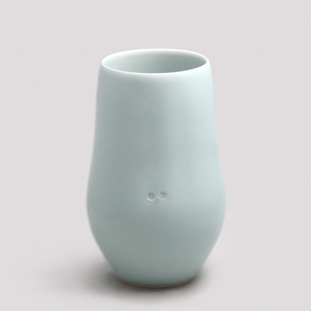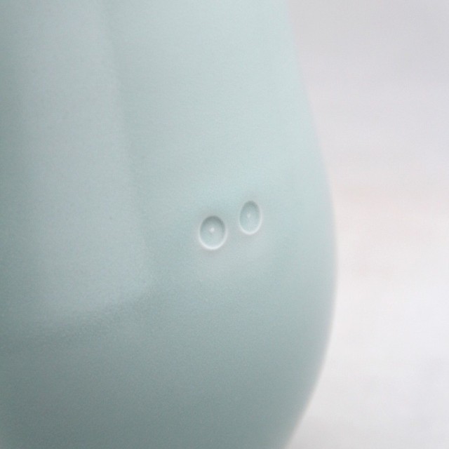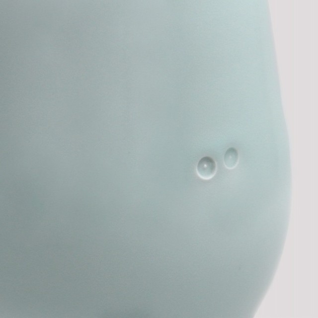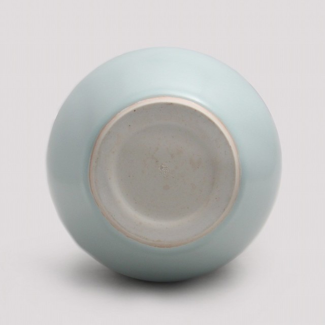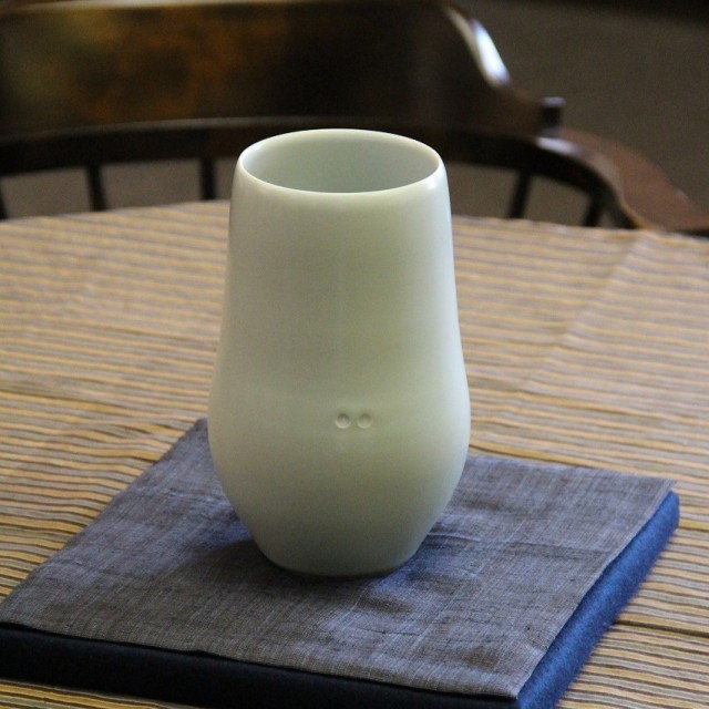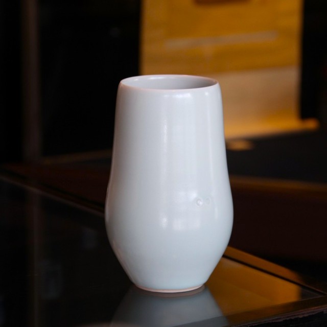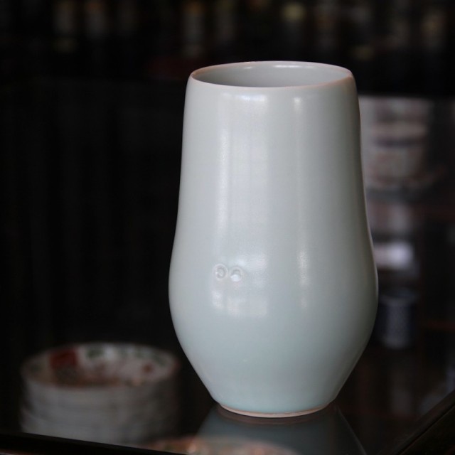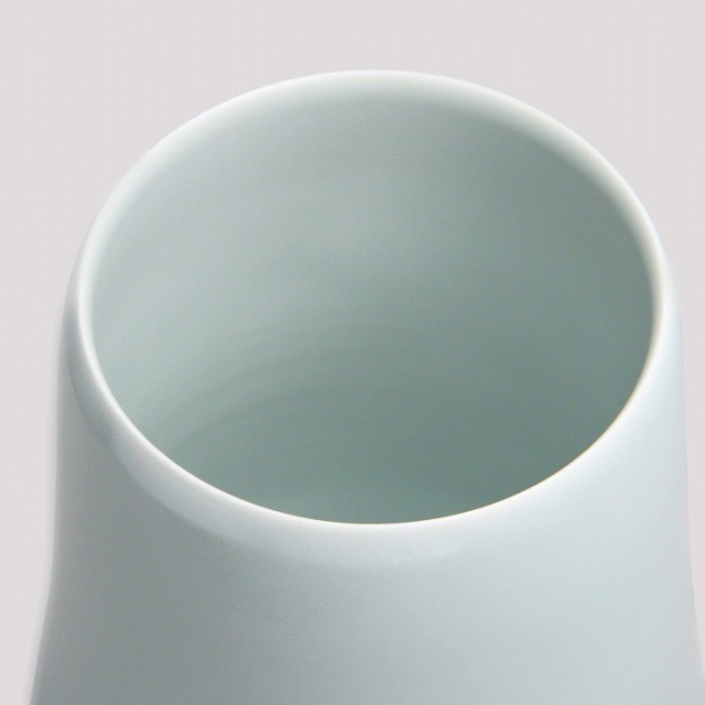 深見氏の作品は、極限までそぎ落とされた造形と、澄みきった釉薬の美しさによって、まるで静寂そのものをかたちにしたような佇まいを見せます。この花瓶もその例に漏れず、無駄のないフォルムと、薄く繊細な青白磁の釉調が特徴です。見る角度によってほんのわずかに表情を変え、光を柔らかく包み込む姿は、まるで静かに呼吸をしているかのよう。