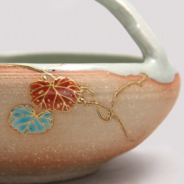 紅葉した蔦の葉と、瑞々しい青葉が繊細に描かれ、季節の移ろいを感じさせる趣ある意匠となっています。外側は釉薬を施さず、素朴で温かみのある焼締の風合いが魅力です。一方、内側には釉薬がかけられ、細やかな貫入が生まれ、静かな美しさとともに、器としての深い味わいを感じさせます。