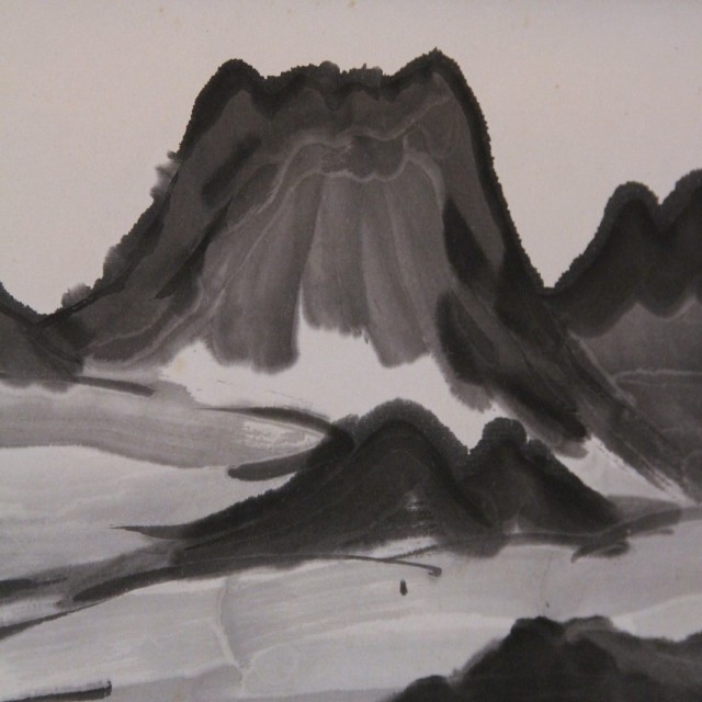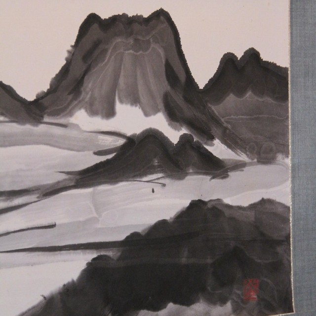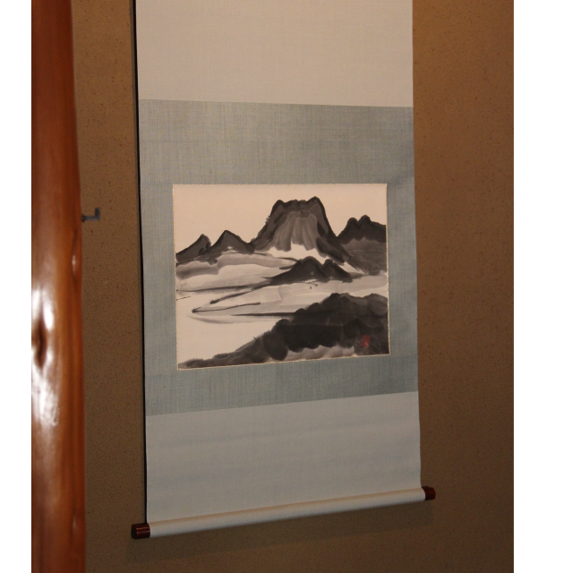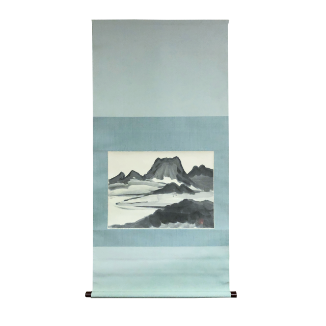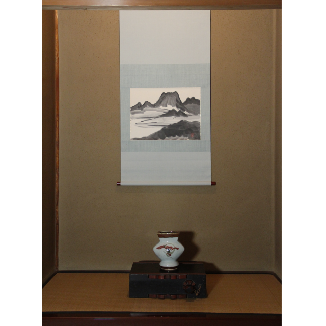 陶芸家で人間国宝であった近藤悠三が妙高を描いた掛軸です。富本憲吉の助手となり、陶芸を学んだ悠三は、独立する際に富本から陶芸以外のことを身につけるように助言されました。その後、関西美術学院でデッサンを学び絵の基礎を学びました。また、津田青楓からも漢詩と絵を学びました。そして、全国各地の窯場に足を運びました。その土地土地の制作を研究すると共に、スケッチや絵を描きました。本作品もそのような生活のひとつであったのだろうと推測されます。妙高は新潟にある山で、日本百名山に選定されています。また、新潟は近藤悠三の弟子である齋藤三郎の故郷でもあったため、訪ねた際に見た妙高に感動したのかもしれません。