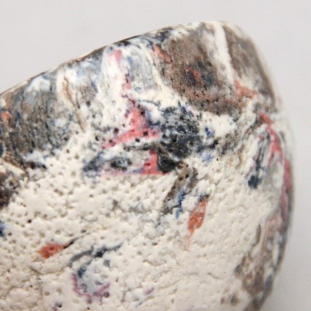 白い土に青・赤・黒の土を重ねて練り込み、破調の趣で流れるような文様を描き出しています。