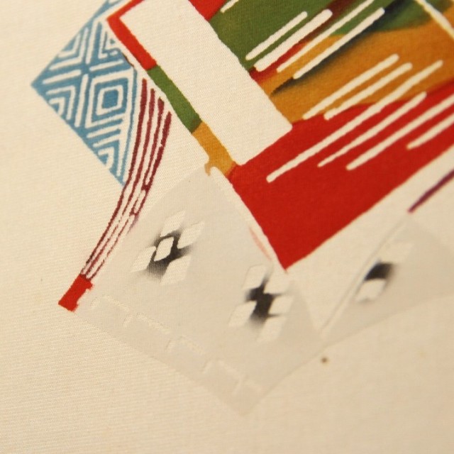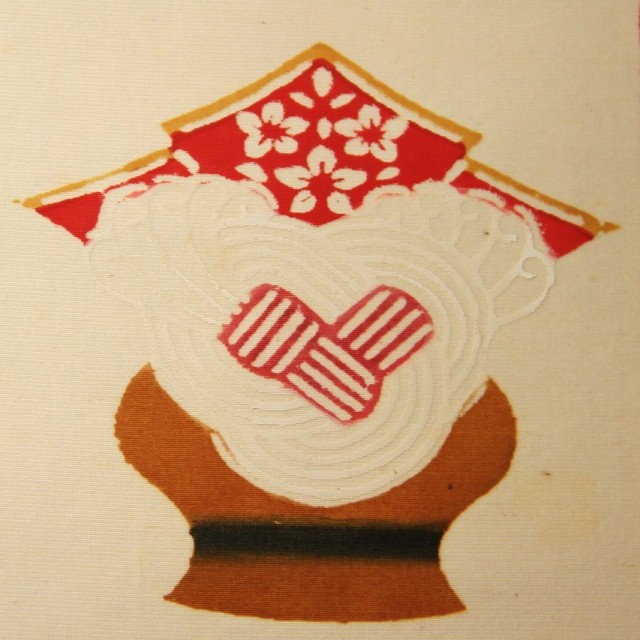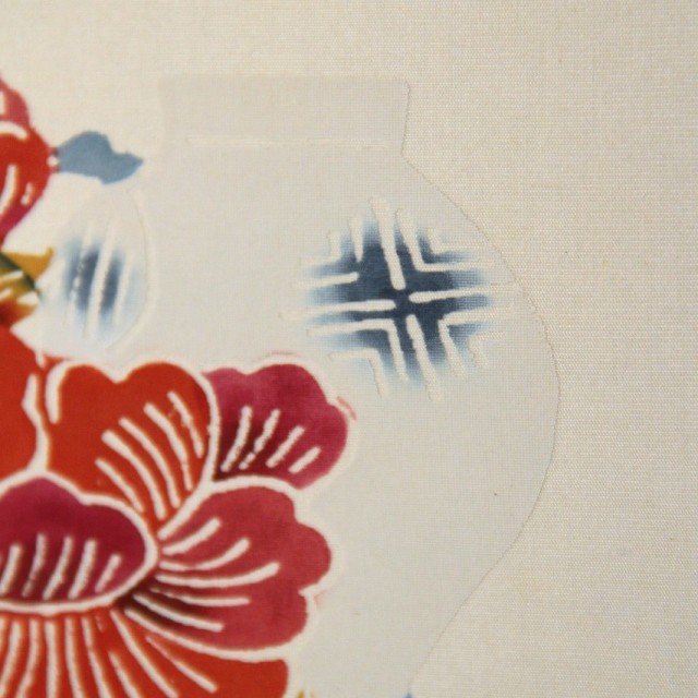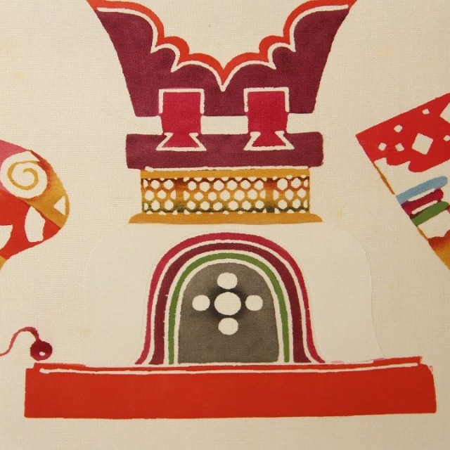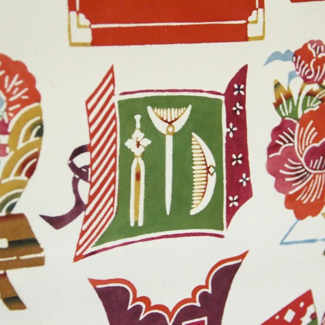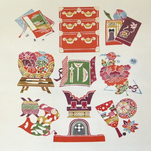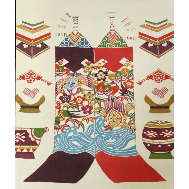 中央上部には愛らしい紙雛が据えられ、その下に雛道具が彩り豊かに配置されています。型染による力強い線と鮮烈な色面が調和し、民藝の精神と芹沢の美意識が見事に結実しています。