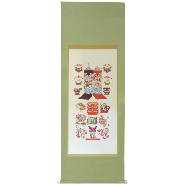 本作は、人間国宝・芹沢銈介が型染技法によって制作した「雛道具紙雛図」の掛幅です。