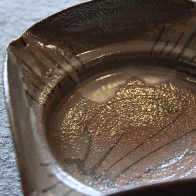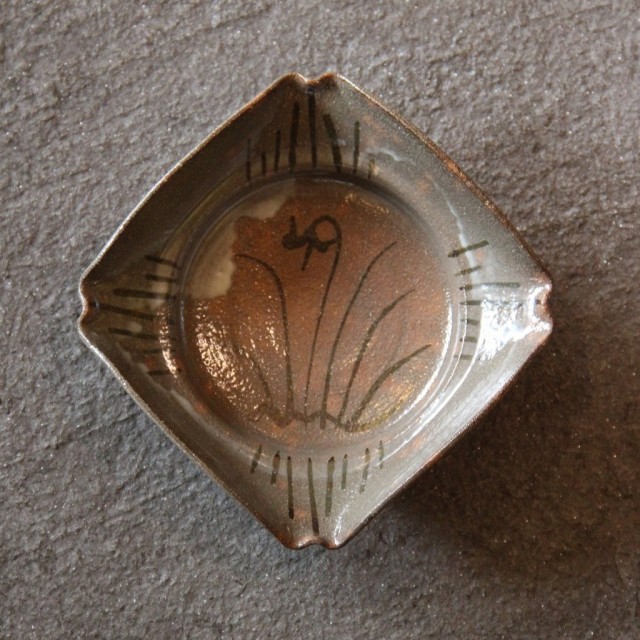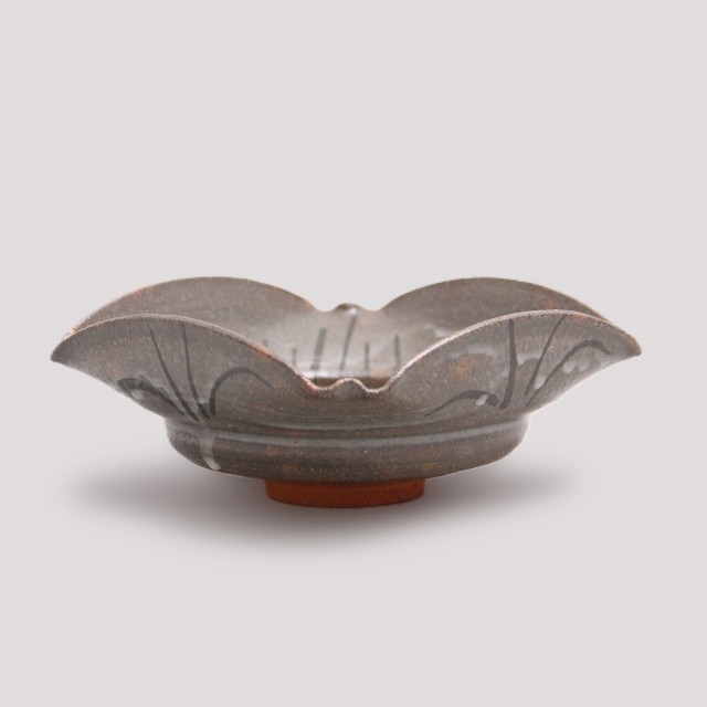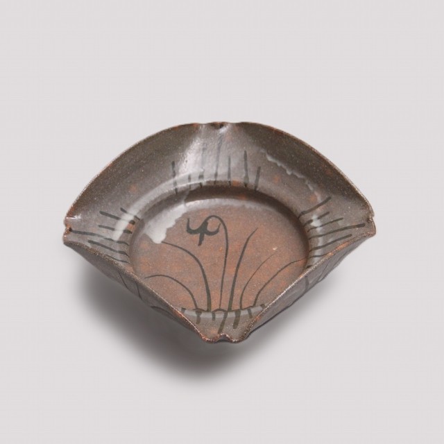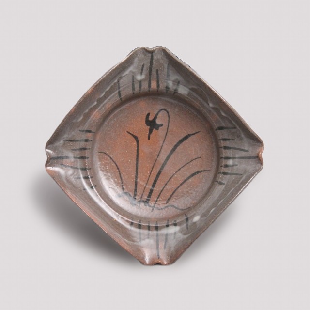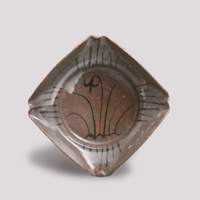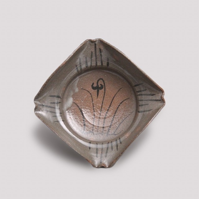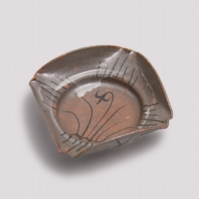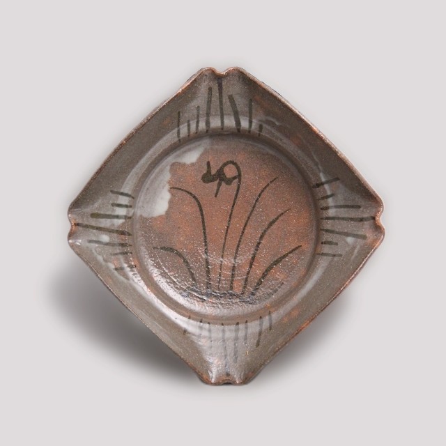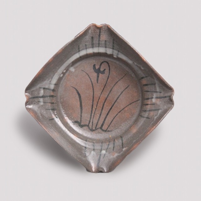 落ち着いた鉄釉の景色に、のびやかな筆致で描かれた草文が映え、絵唐津ならではの素朴さと品格を併せ持つ作品です。