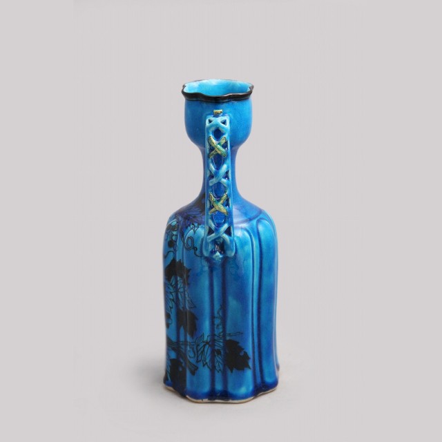 胴部から細く立ち上がる端正なフォルムに、側面の把手が造形的なアクセントを添え、加藤卓男ならではの装飾性と工芸的完成度が感じられます。