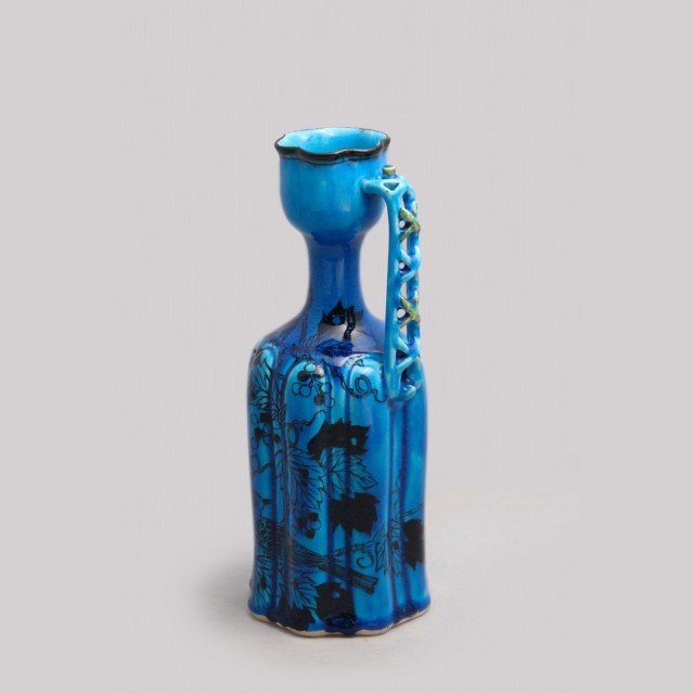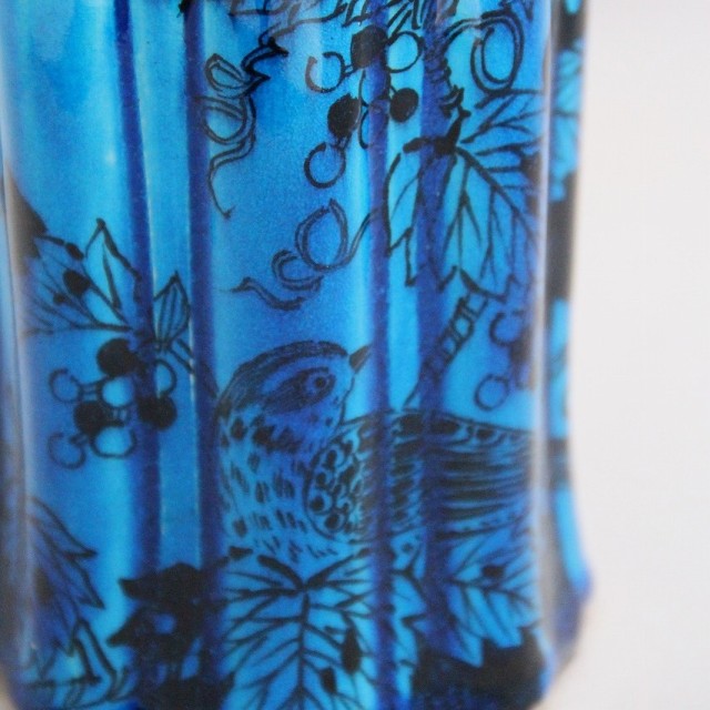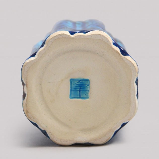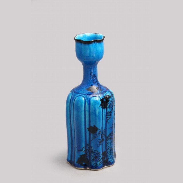 深みのある青釉を全面に施し、花や鳥の文様を黒色の線で表した花入です。艶やかな青の発色と、伸びやかに描かれた花鳥文が調和し、静けさの中に生命感を湛えた作品となっています。