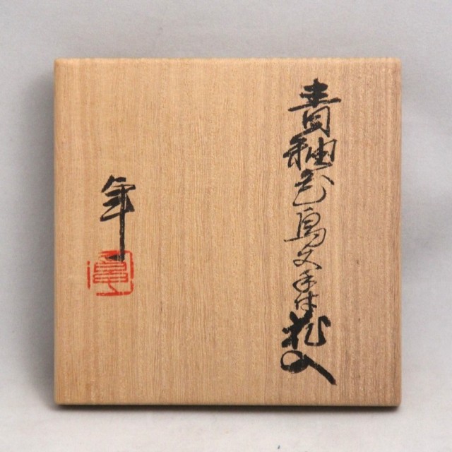 ▲「青釉花鳥文手付花入 卓」と加藤卓男による箱書きがあります。