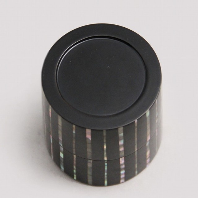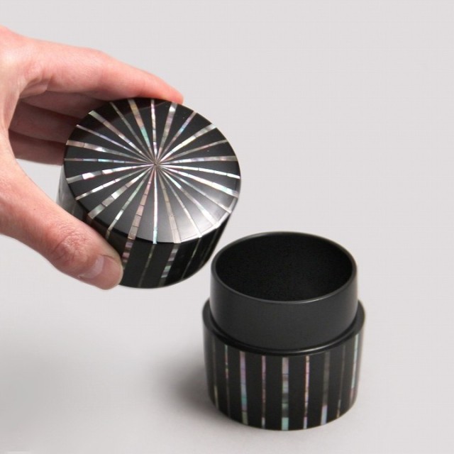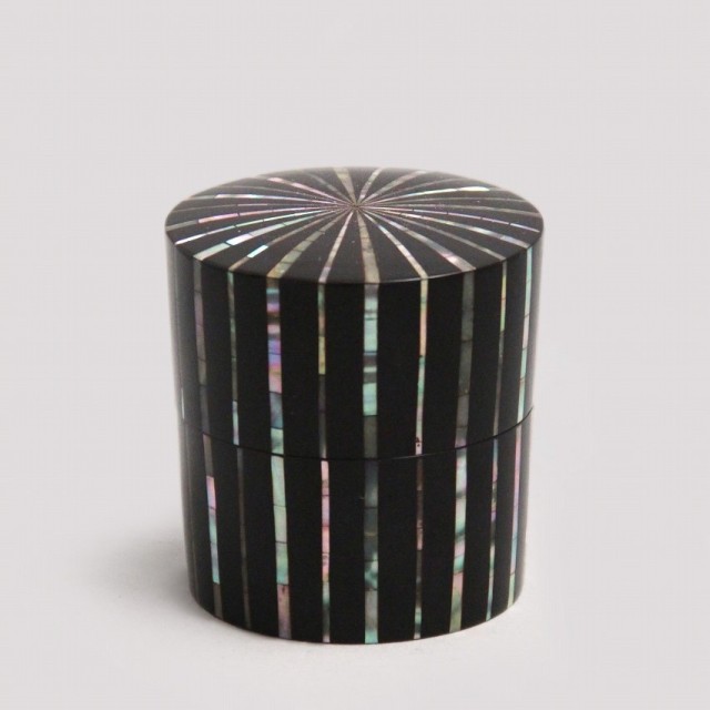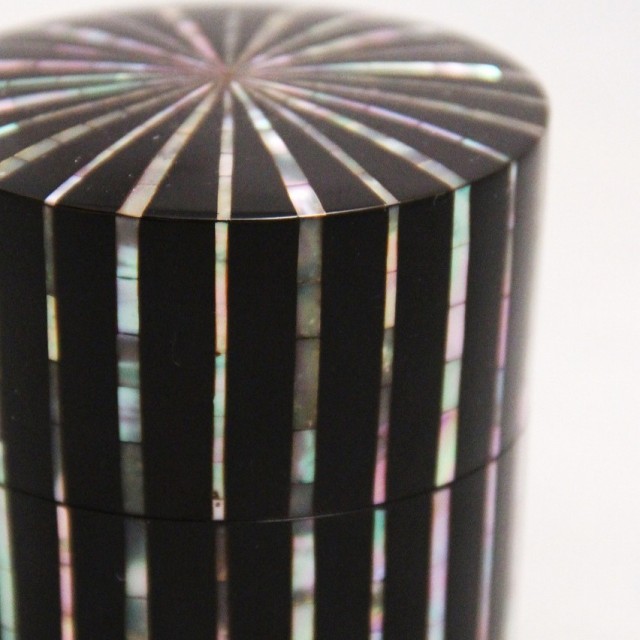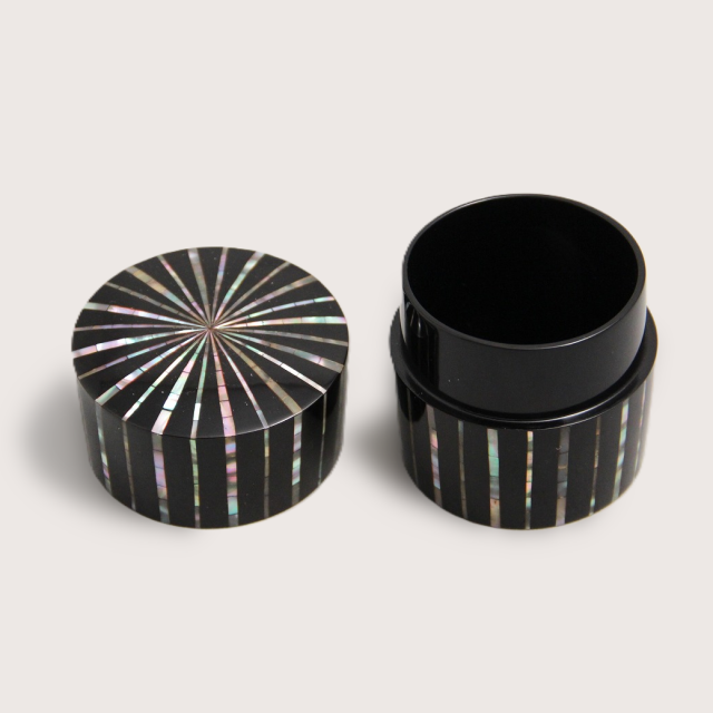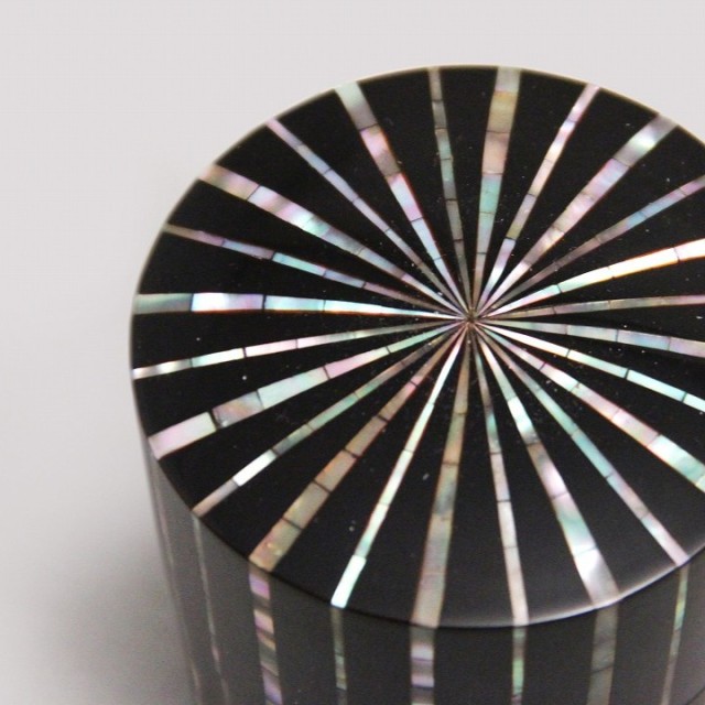 漆黒の面に整然と走る縞文様は、貝の持つ虹色の光を静かに浮かび上がらせ、端正でありながら豊かな表情を生み出しています。