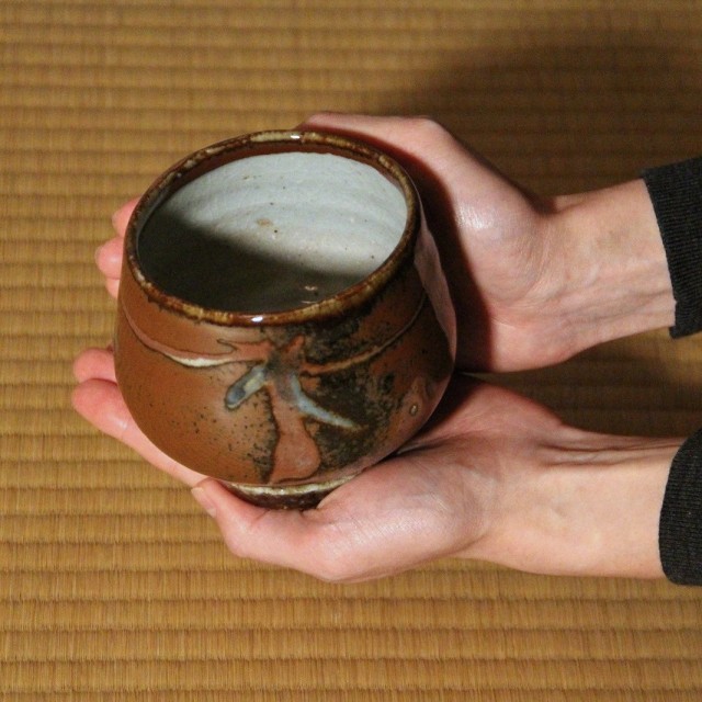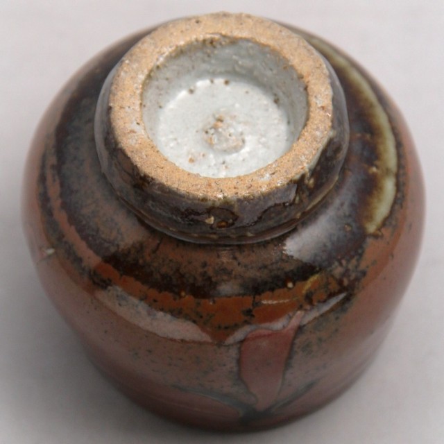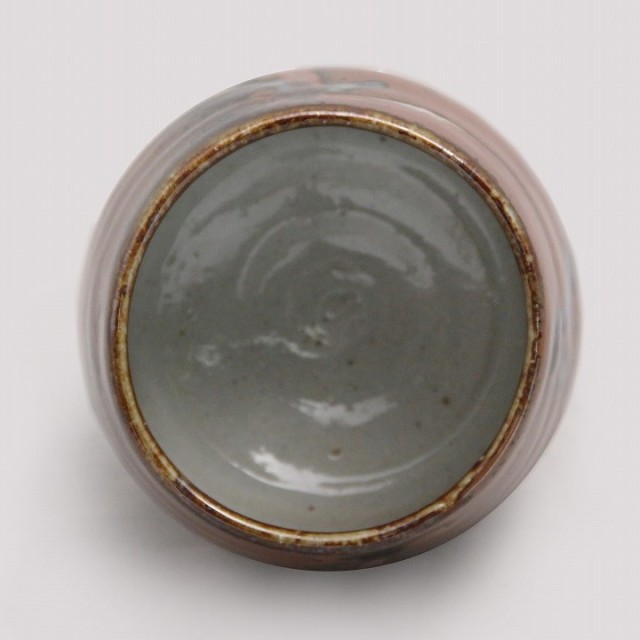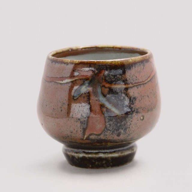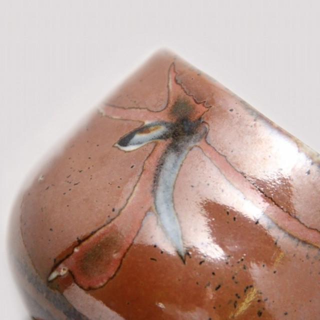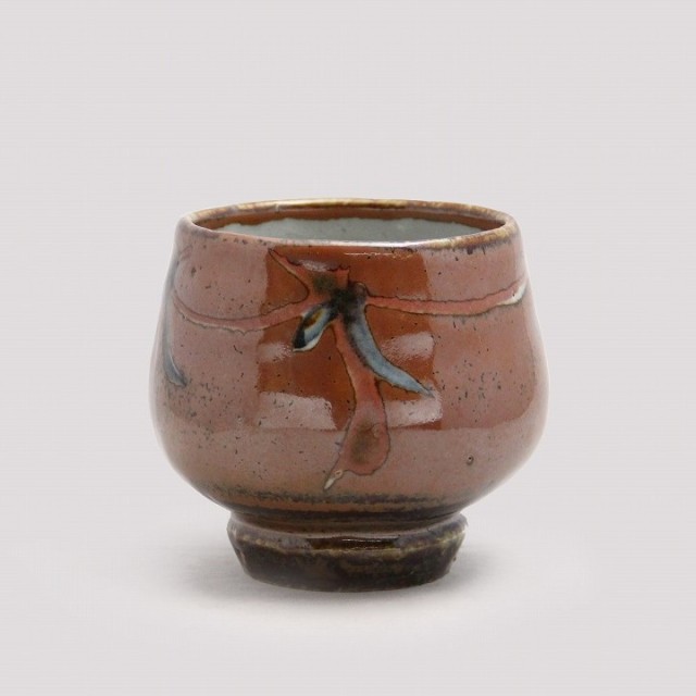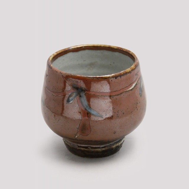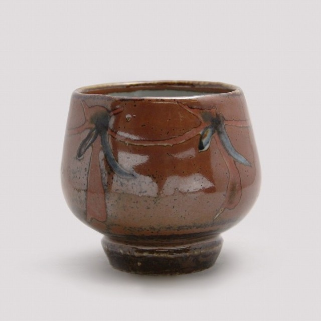温かみのある鉄釉を基調とした地に、辰砂による花文があしらわれ、深みのある発色と柔らかな景色が調和しています。胴部にゆるやかな丸みをもたせた安定感ある造形は、掌に自然と馴染み、用と美が一体となった寛次郎らしい佇まいを感じさせます。