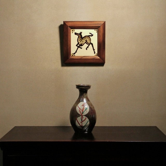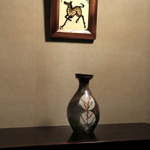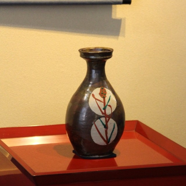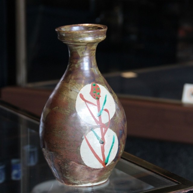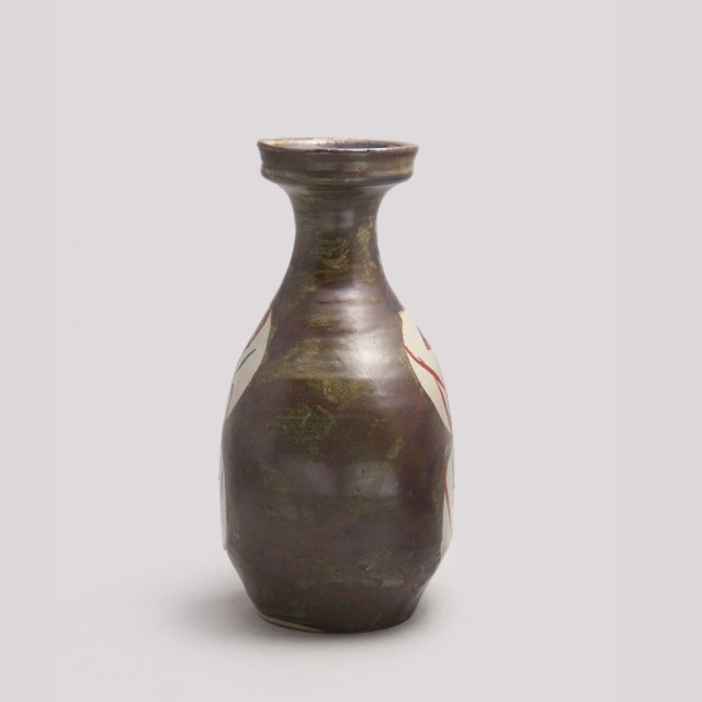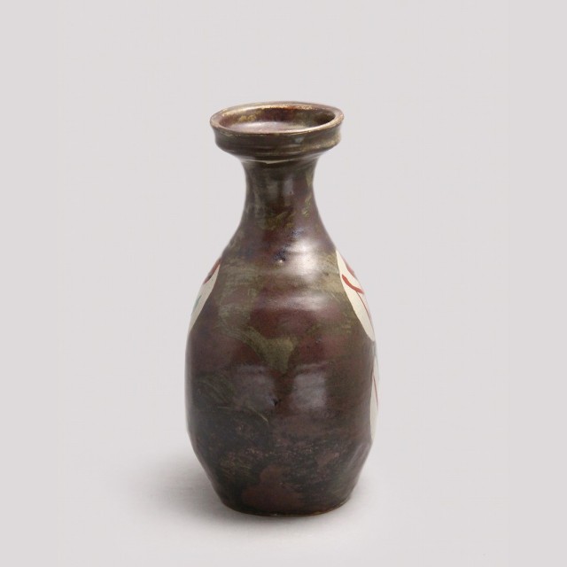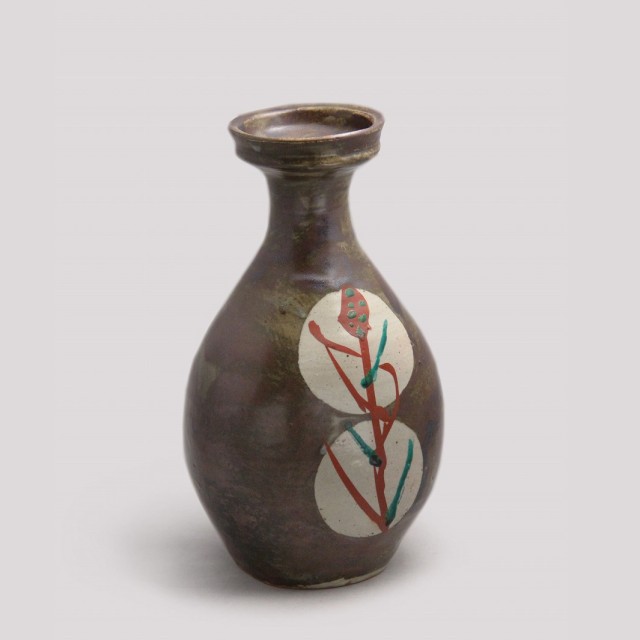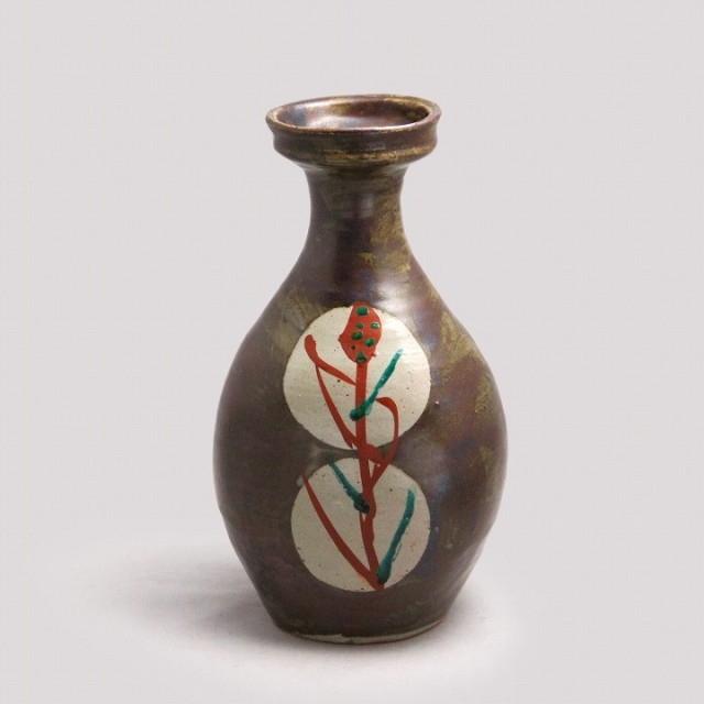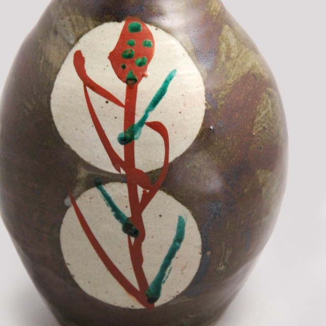 鉄砂による深みある地に、白抜きの丸紋を配し、その中に赤絵と緑彩で糖黍(とうきび)文様を描いた花瓶です。
