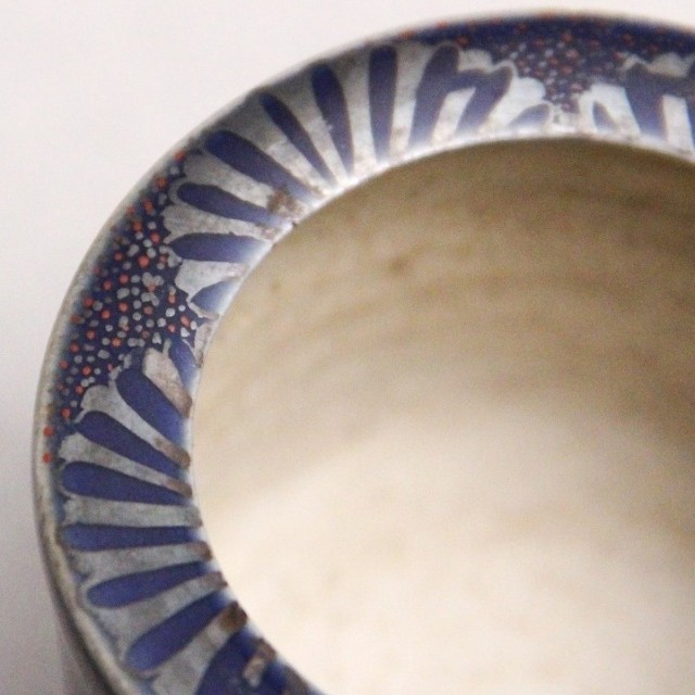 落ち着いた紺碧の地色に、繊細なタッチで菊文様が描かれています。菊は高貴さと長寿の象徴であり、古来より愛されてきたモチーフです。