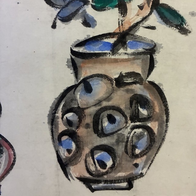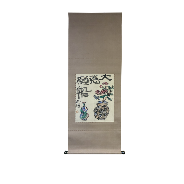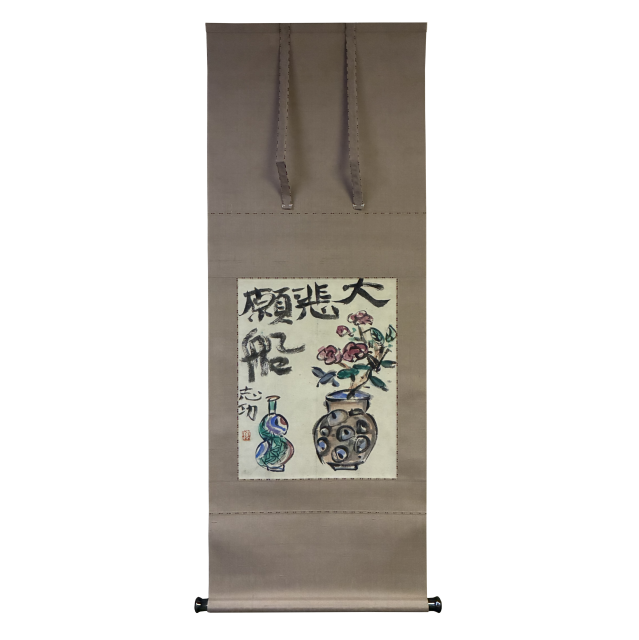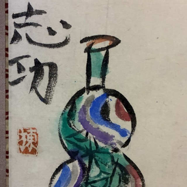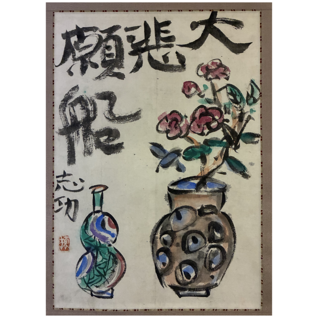 世界のムナカタとして知られる板画家・棟方志功による肉筆画の掛軸です。力強い筆致で描かれた「大悲願船」の文字と、生命力あふれる草花を活けた壷、そして瓢箪を模したような瑞々しい色調の器が配されています。