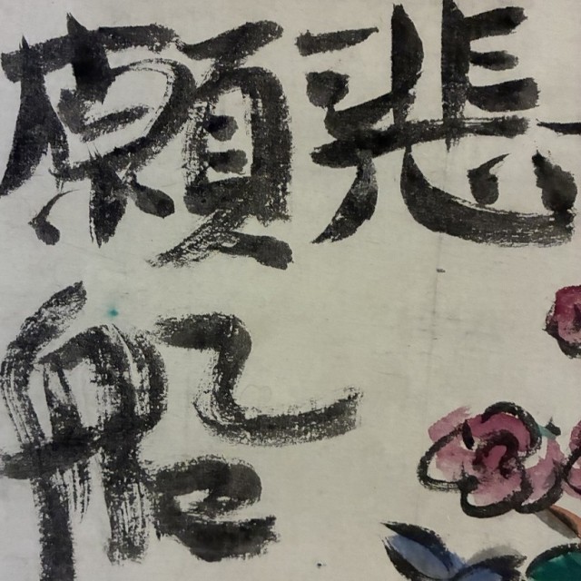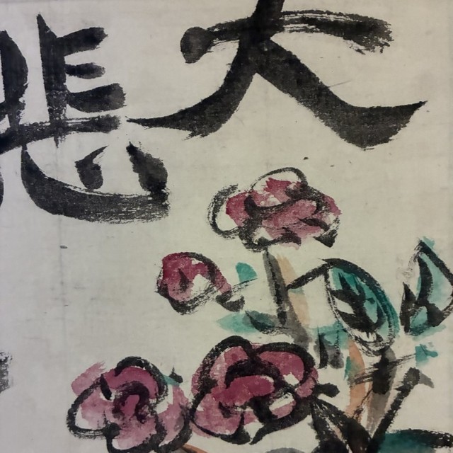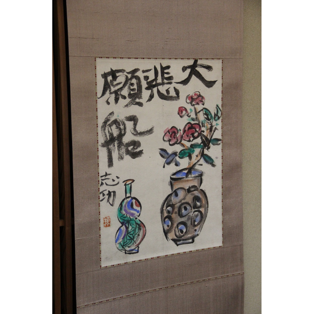 ▲力強い筆致で描かれた「大悲願船」の文字と、生命力あふれる草花を活けた壷、そして瓢箪を模したような瑞々しい色調の器が配されています。