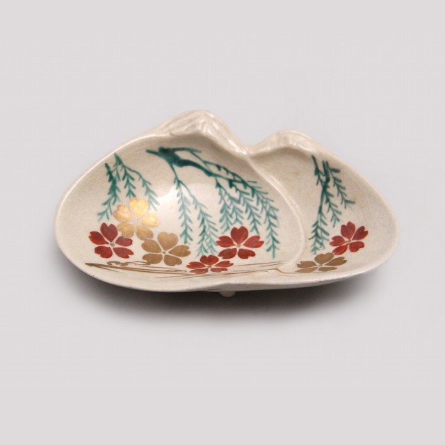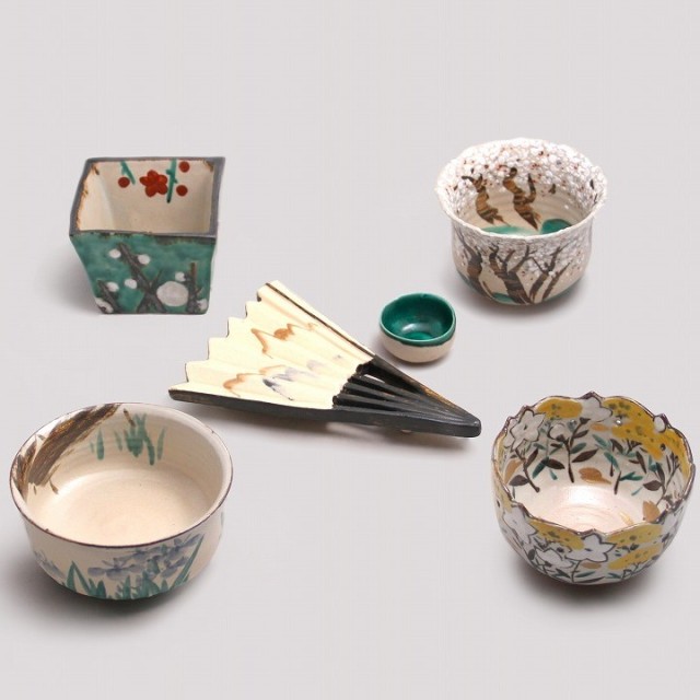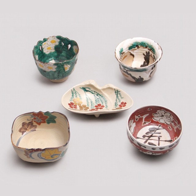 一点一点異なる形や絵付けを施した器を組み合わせた寄向付です。桜、菖蒲、楓、松、梅、扇、貝など、日本の四季を象徴する草花や吉祥文様が、乾山写しの伝統を感じさせる鮮やかな色彩と繊細な筆致で描かれています。